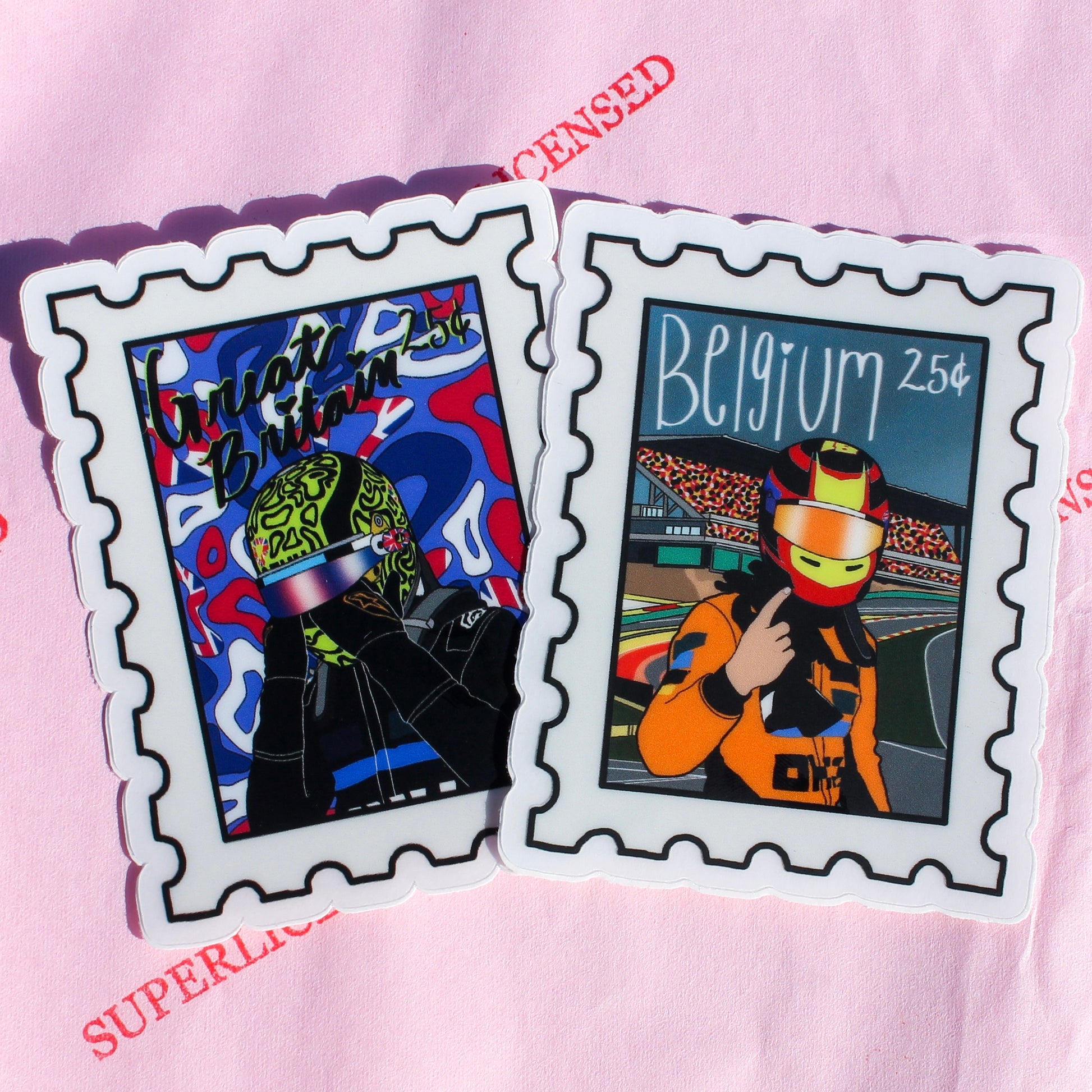 Save and buy all the July stamps! This includes Oscar Piastri win in Belgium and Lando Norris win in Great Britain . Both are clear waterproof vinyl stickers around 2.4”x3.0” in size or mini 2.0 x 1.6.